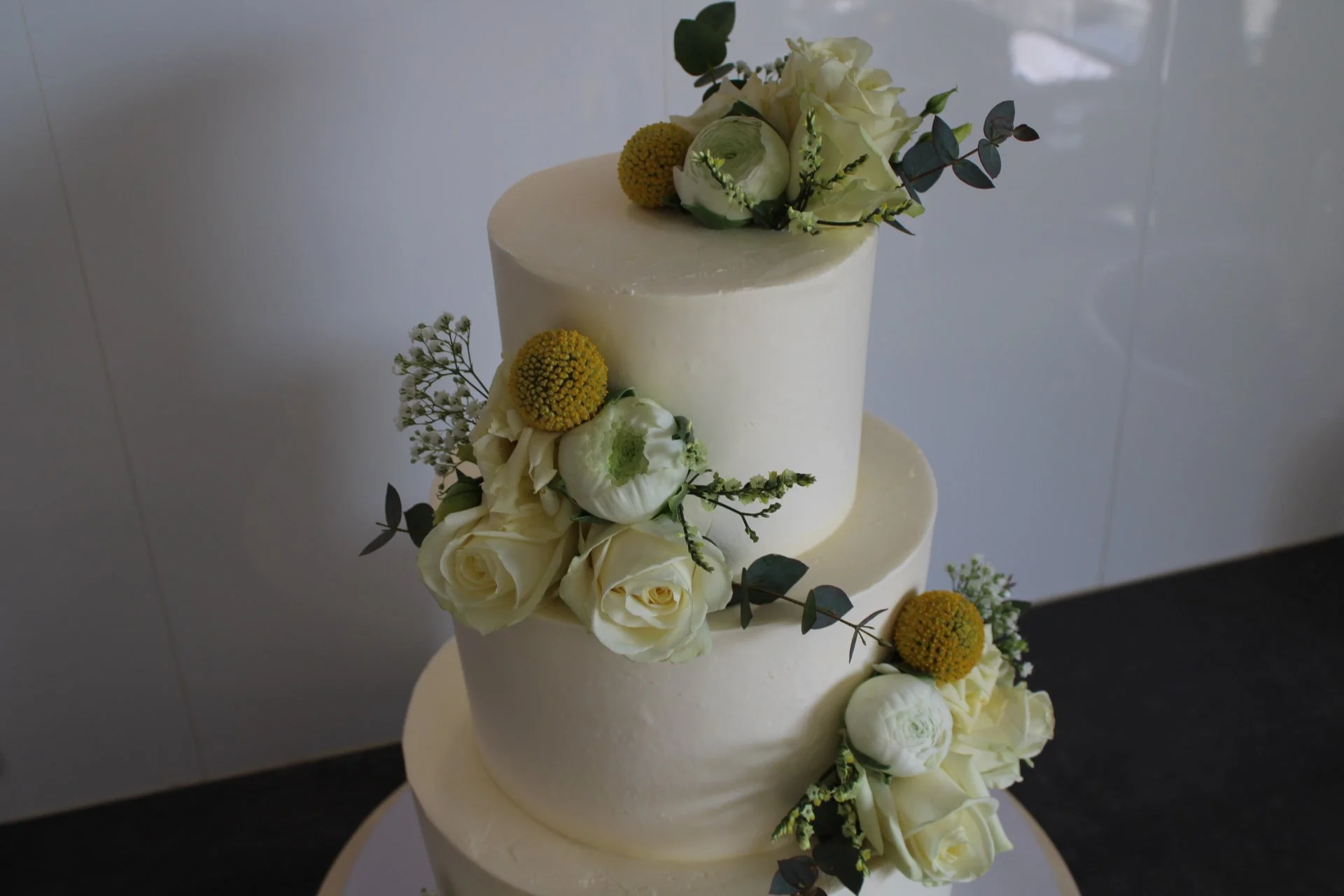 Alex en Aurelia waren opzoek naar de perfecte bruidstaart. Ze hadden daarom een afspraak ingepland om ideeën te bespreken en zodat ze van alles konden proeven. De bruidstaart bestond uit 3 lagen voor ca. 24-28 personen. Alex en Aurelia hebben gekozen voor de vullingen: mango passievrucht curd, frambozen creme + verse stukjes framboos en Zwitserse room gecombineerd in elke taart. De bruidstaart is strak afgesmeerd met witte botercrème. Als decoratie hebben Alex en Aurelia gekozen om boeketjes bloemen toe te voegen dezelfde als het boeket. De bloemen werden aangeleverd van De Snijbloem uit ‘s-Gravendeel. De bruidstaart mocht bezorgd worden bij het Land van Wale in Heinenoord.
