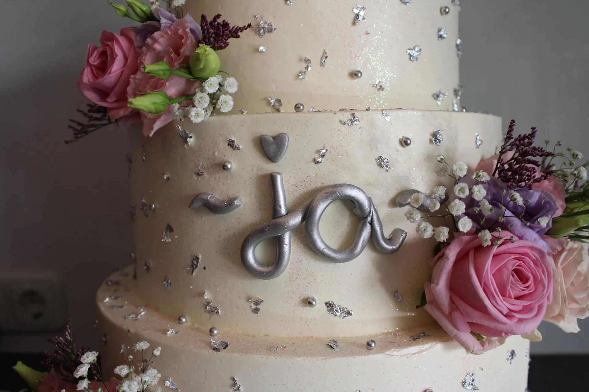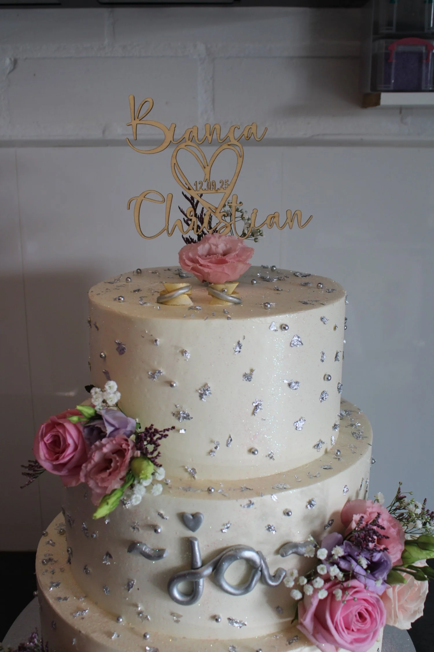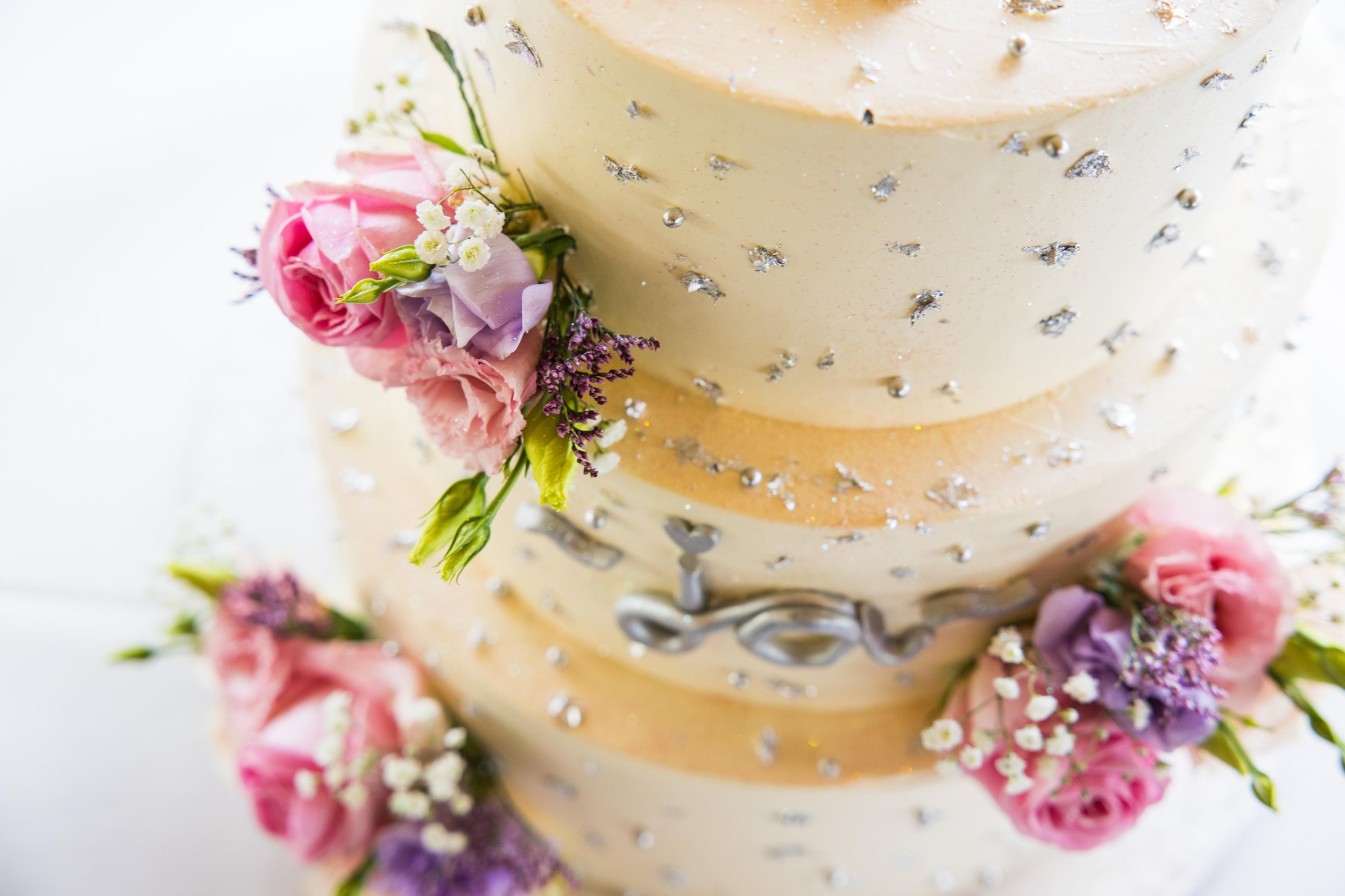 Christian en Bianca waren opzoek naar de perfecte bruidstaart. Ze hadden daarom al snel een afspraak ingepland om ideeën te bespreken en zodat ze van alles konden proeven. De bruidstaart bestond uit 3 lagen voor ca. 50 personen. Christian en Bianca hebben gekozen voor de vullingen Zwitserse room en Lemon curd gecombineerd in alle lagen met verse stukjes aardbei en framboos. De bruidstaart is strak afgesmeerd met witte botercrème. Als decoratie hebben Christian en Bianca gekozen om verse bloemen te gebruiken, op elke laag een boeketje. De bloemen werden geleverd door AB bloemen en waren hetzelfde als het bruidsboeket. Verder mocht er flink glitter, bladzilver en de fondant decoratie ~ ja ~ en de ringen op de bruidstaart worden toegevoegd. De beschrijving tijdens de bruidsproeverij was: ‘‘een beetje alsof er een confetti canon tegenaan geschoten is’’. Dat is goed gelukt al zeg ik het zelf. Verder hebben Christian en Bianca een gepersonaliseerde houten taarttopper aangeleverd die de bruidstaart helemaal afmaakt. De bruidstaart mocht bezorgd worden bij de Koningshoeve.