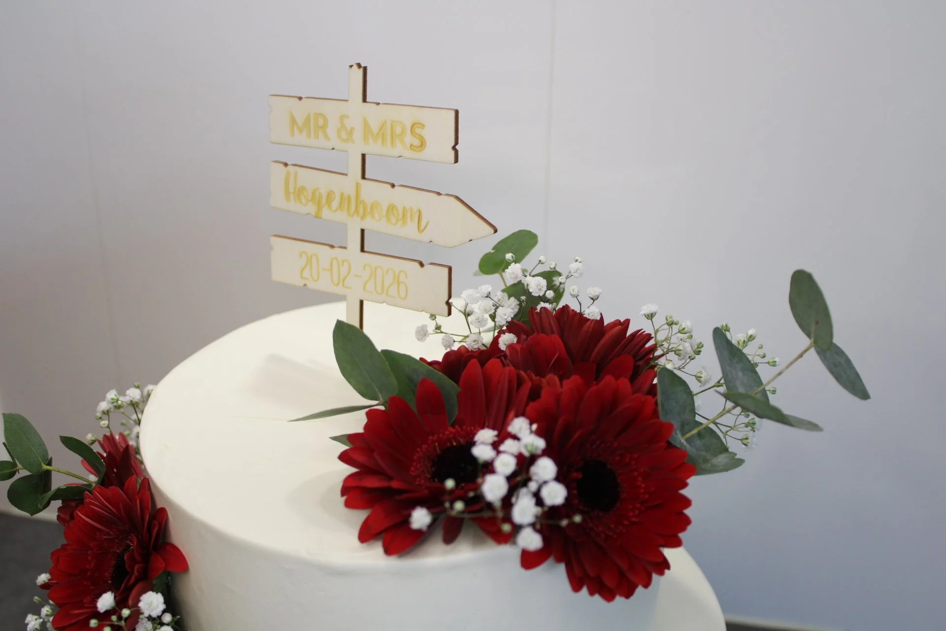 Erik en Lisa waren opzoek naar de perfecte bruidstaart. Ze hadden daarom al snel een afspraak ingepland om ideeën te bespreken en zodat ze van alles konden proeven. De bruidstaart bestond uit 2 lagen voor ca. 25 personen. Erik en Lisa hebben gekozen voor de vullingen: Zwitserse room, melk chocolade creme en gele room gecombineerd in elke taart. De bruidstaart is strak afgesmeerd met witte botercrème. Als decoratie hebben Erik en Lisa gekozen om boeketjes bloemen toe te voegen dezelfde als het boeket. Voor bovenop werd er een gepersonaliseerde taarttopper besteld om zo de taart helemaal af te maken. De bruidstaart mocht bezorgd worden bij de Koningshoeve. Verder bestelde ze ook nog een doos chocolade cupcakes met een eetbare print met initialen en datum en waarvan er één speciaal met een print van Erik in zijn tank.