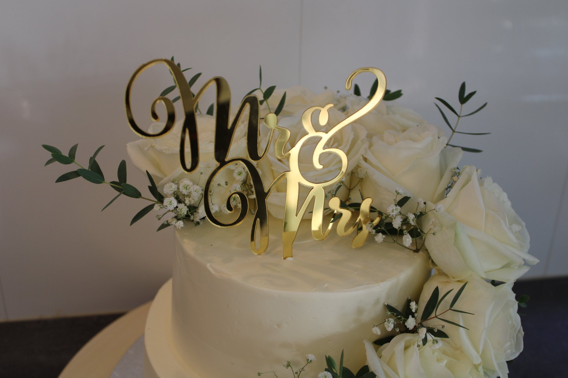 Als verrassing heeft Anne haar moeder een bruidstaart besteld voor het geregistreerd partnerschap wat Gionny en Anne aangingen. De bruidstaart bestond uit 2 lagen en was voor ca. 20 personen. De taartsmaak was red velvet met witte chocolade creme als vulling. De bruidstaart is strak afgesmeerd met witte botercrème. Als decoratie hebben we gekozen om verse bloemen te gebruiken in een slinger van boven naar beneden. Verder werd er gekozen voor een gouden Mr & Mrs taarttopper.