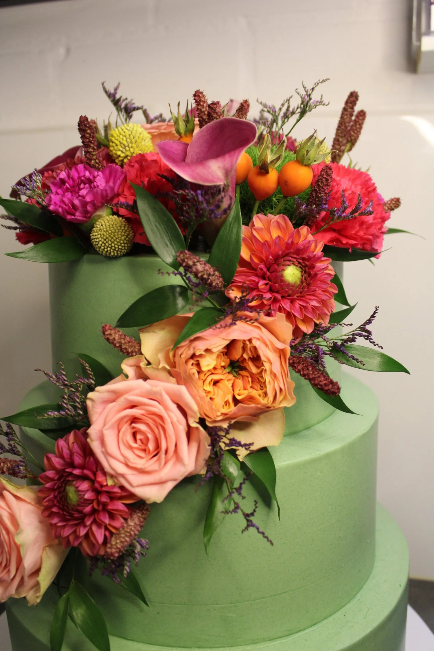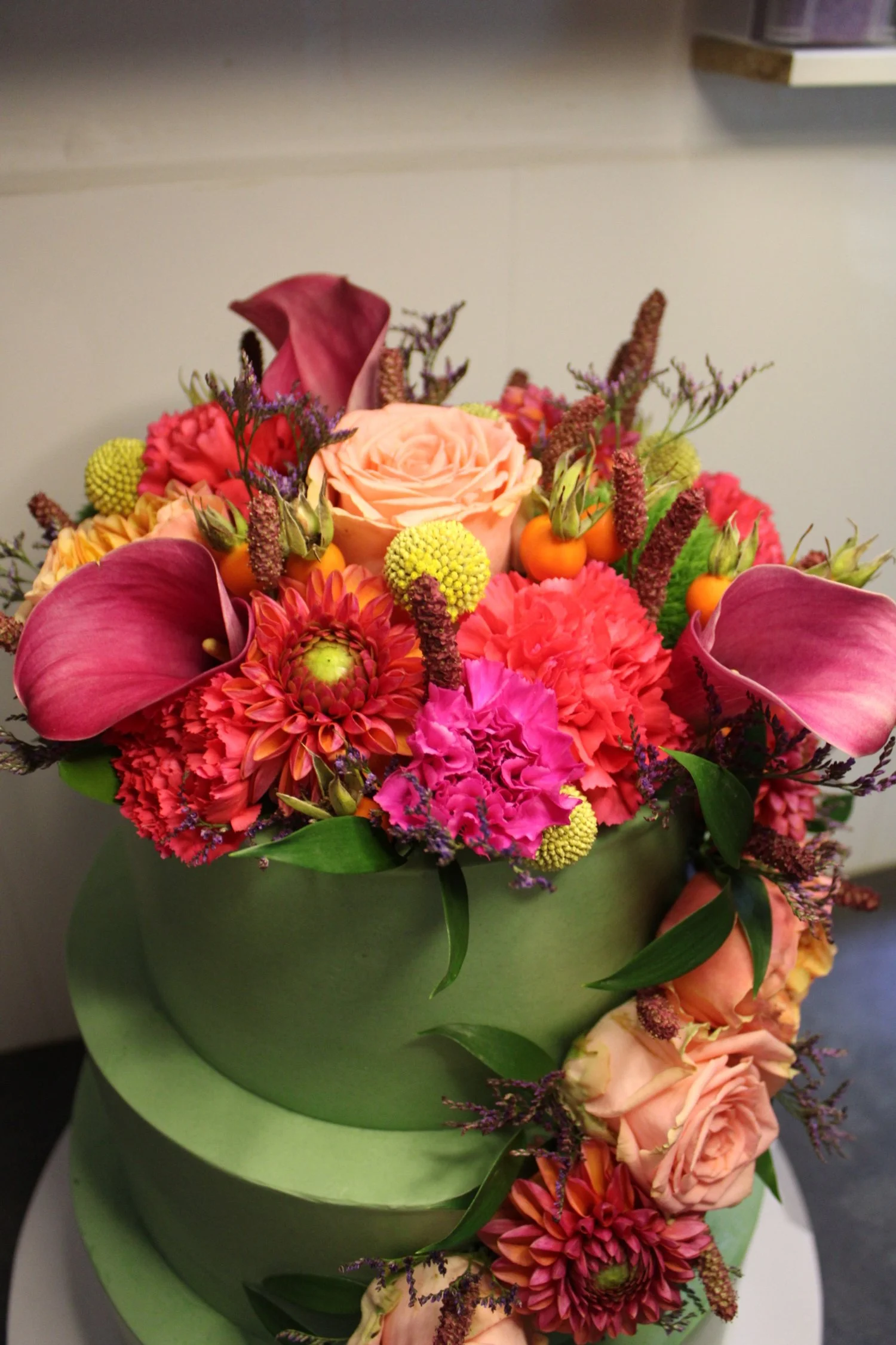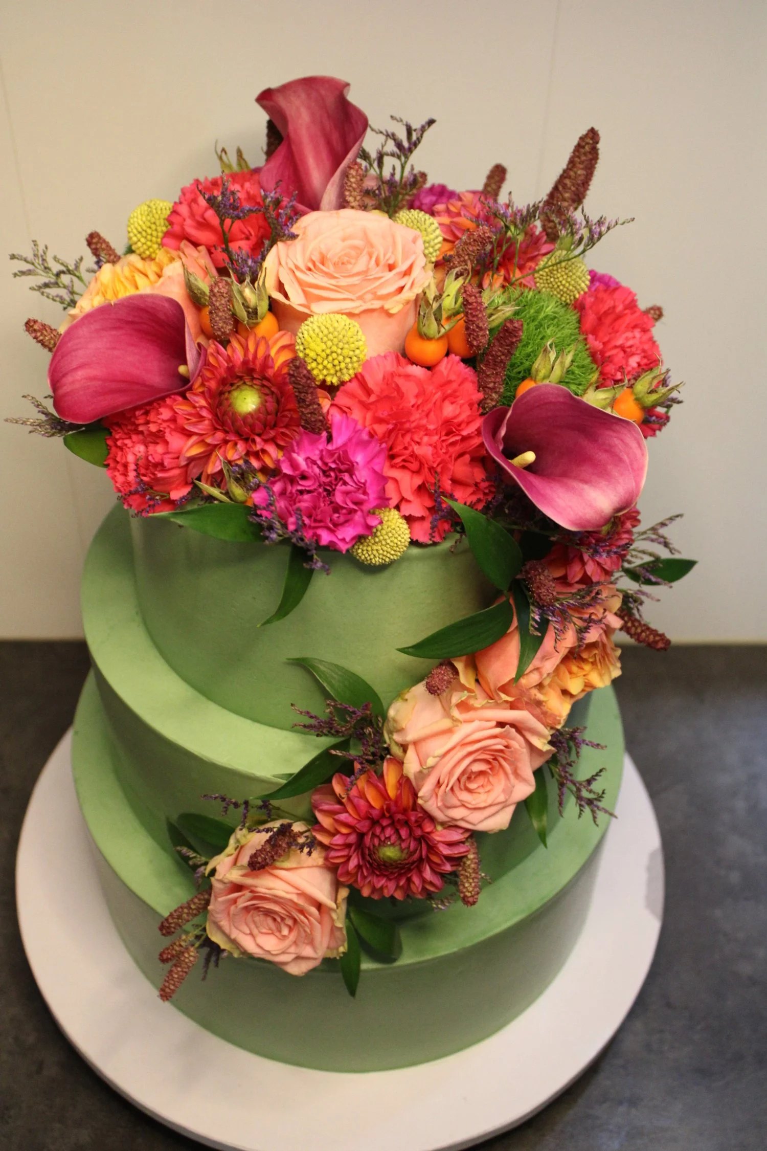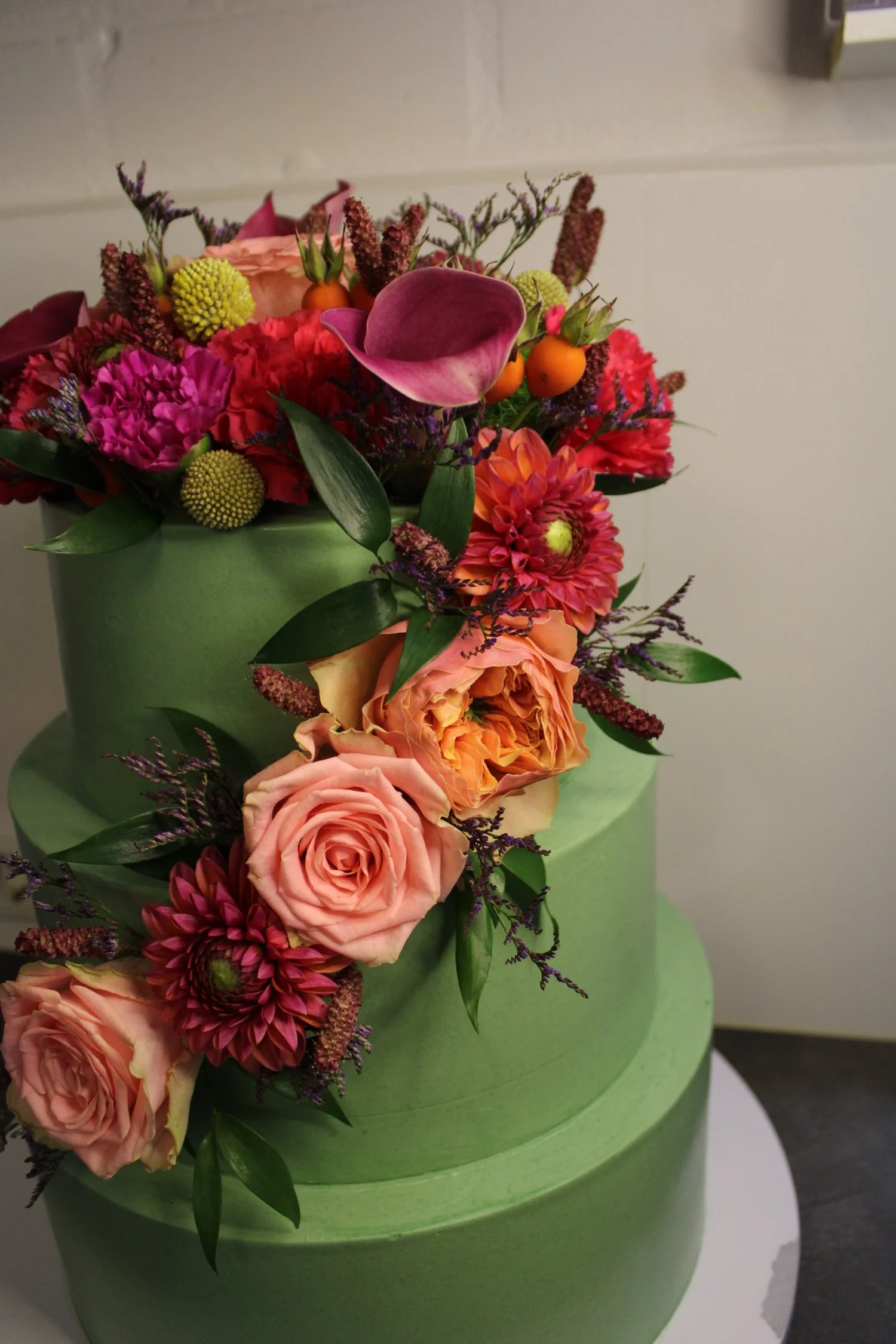 Sandrina hebben gekozen voor een aantal verschillende vullingen combinaties. Namelijk: Zwitserse room en lemon curd + verse stukjes framboos, aardbei creme en Zwitserse room + verse aardbei stukjes en Zwitserse room en mango passievrucht curd + verse stukjes framboos. De bruidstaart is strak afgesmeerd met groene botercrème. Als decoratie hebben Henk en Sandrina gekozen om verse bloemen te gebruiken, bovenop een boeket en als slinger tot halverwege de taart. De prachtige bloemen werden geleverd door Bloemsierkunst van der Steeg en waren hetzelfde als het bruidsboeket. De bruidstaart mocht bezorgd worden bij het Schippershuis.