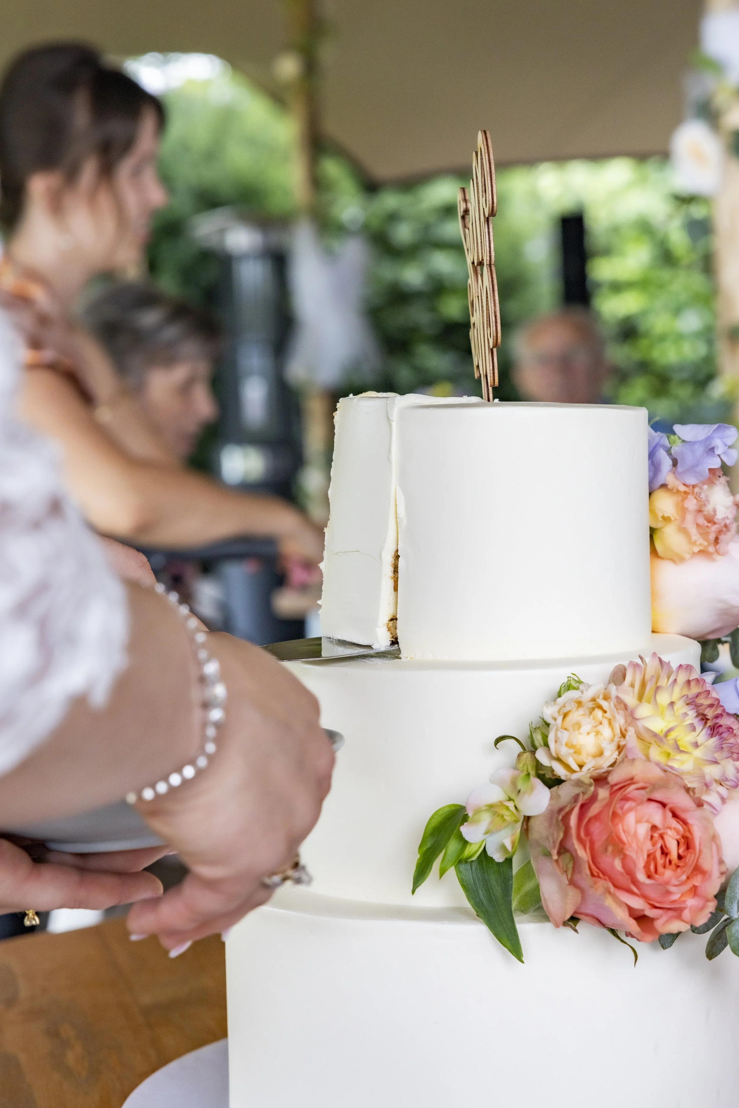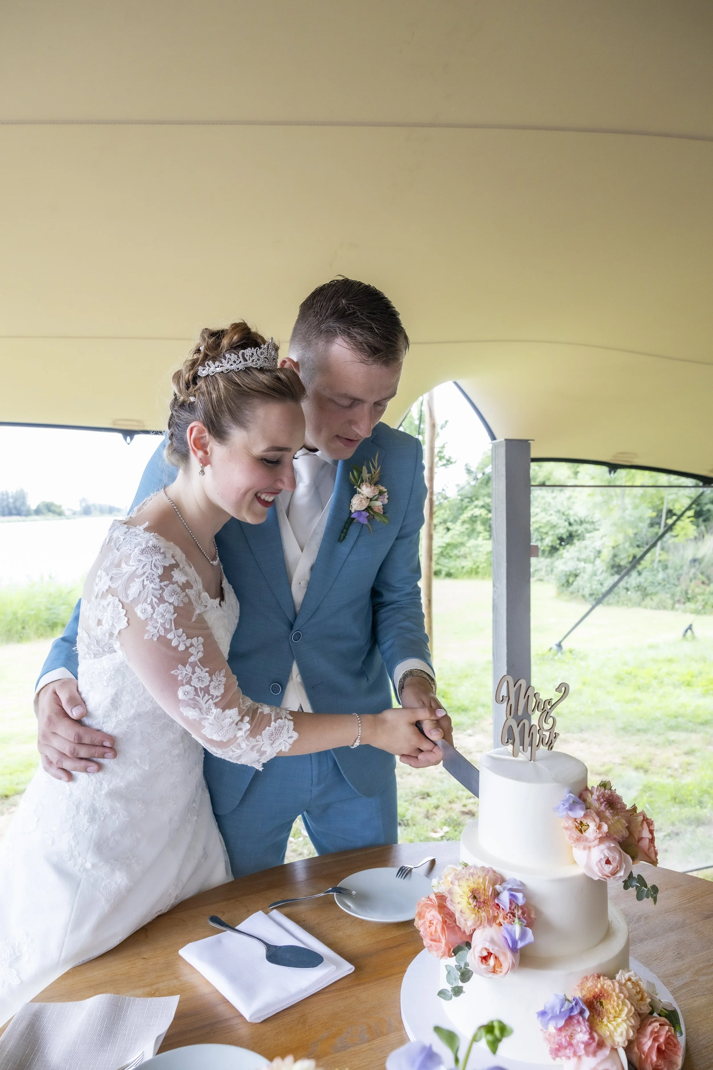Koen en Eliza waren opzoek naar de perfecte bruidstaart. Ze hadden daarom al snel een afspraak ingepland om ideeën te bespreken en zodat ze van alles konden proeven. De bruidstaart bestond uit 3 lagen en was voor ca. 25 personen. Koen en Eliza hebben gekozen voor drie verschillende vullingen en deze allemaal gecombineerd in elke laag zodat iedereen dezelfde smaken had. Ze kozen voor mango passievrucht curd, gele room en lemon curd en als extra toevoeging vers aardbeien en frambozen stukjes. De bruidstaart is strak afgesmeerd met witte botercrème. Als decoratie hebben Koen en Eliza gekozen om verse bloemen te gebruiken op elke laag, dezelfde als het bruidsboeket. De bloemen werden geleverd door Bloemen in het hof uit Oud-Beijerland. Als topper hebben ze gekozen voor een houten taarttopper.