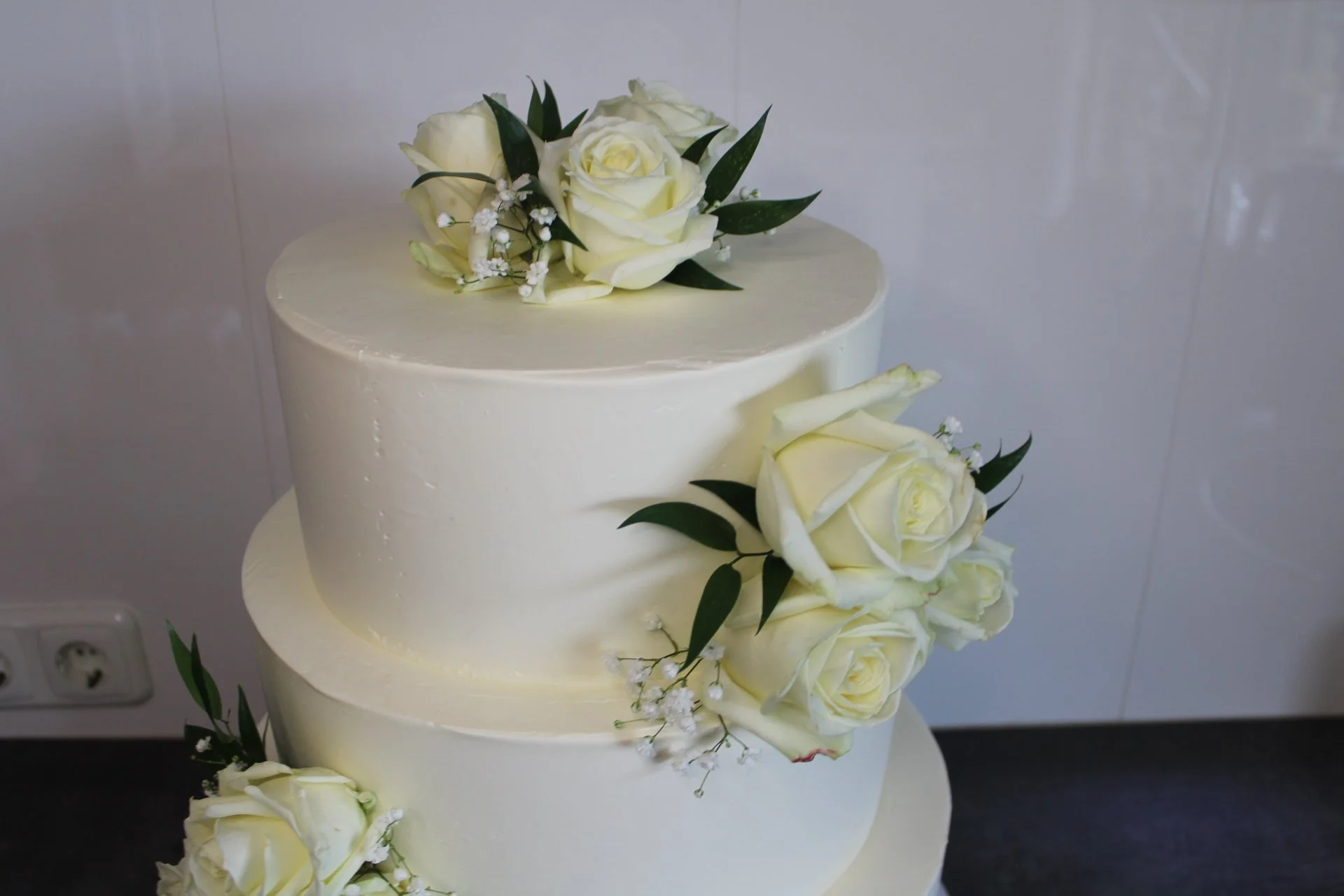 René en Charlotte waren opzoek naar de perfecte bruidstaart. Ze hadden daarom al snel een afspraak ingepland om ideeën te bespreken en zodat ze van alles konden proeven. De bruidstaart bestond uit 3 lagen voor ca. 60 personen. René en Charlotte hebben gekozen voor de vullingen: Zwitserse room en slagroom met vers fruit aardbei en frambozen stukjes en gecombineerd in elke taart. De bruidstaart is strak afgesmeerd met witte botercrème. Als decoratie hebben René en Charlotte gekozen om boeketjes bloemen toe te voegen dezelfde als het boeket. De bruidstaart mocht bezorgd worden bij het Kasteel van Rhoon. Verder bestelde ze een klein taartje voor iemand met een fruit allergie. Ook bestelde ze voor de avondgasten nog mini en normale vanille en red velvet cupcakes.