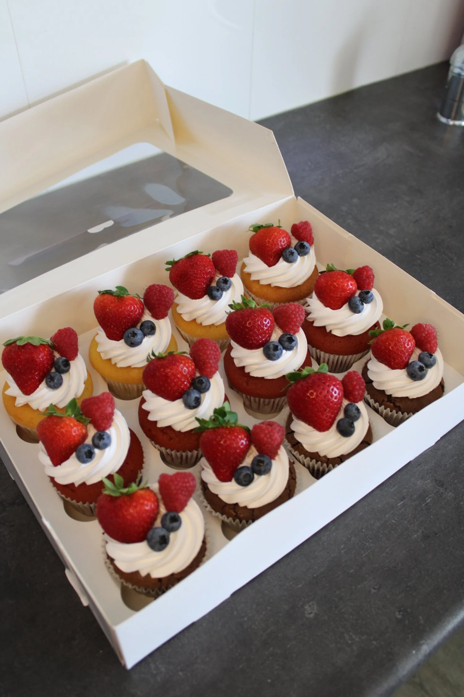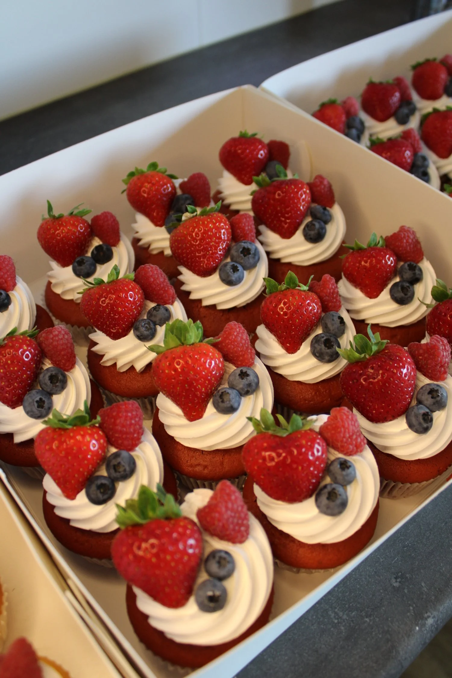 Verder bestelde Robin en Christianne verschillende cupcakes, van elke 20 stuks. Ze kozen vanille, red velvet en chocolade cupcakes. Alle cupcakes mochten worden opgespoten met witte enchanted cream en gedecoreerd worden met vers fruit.