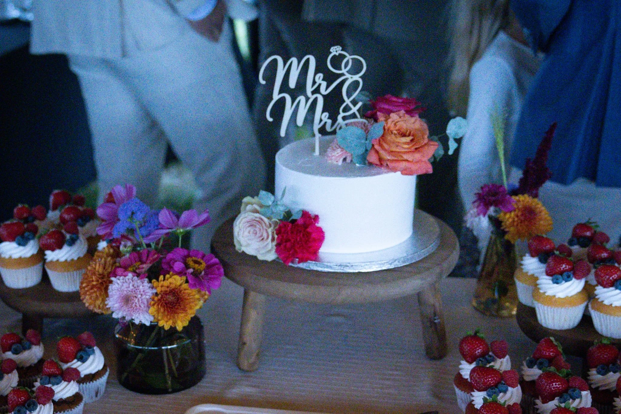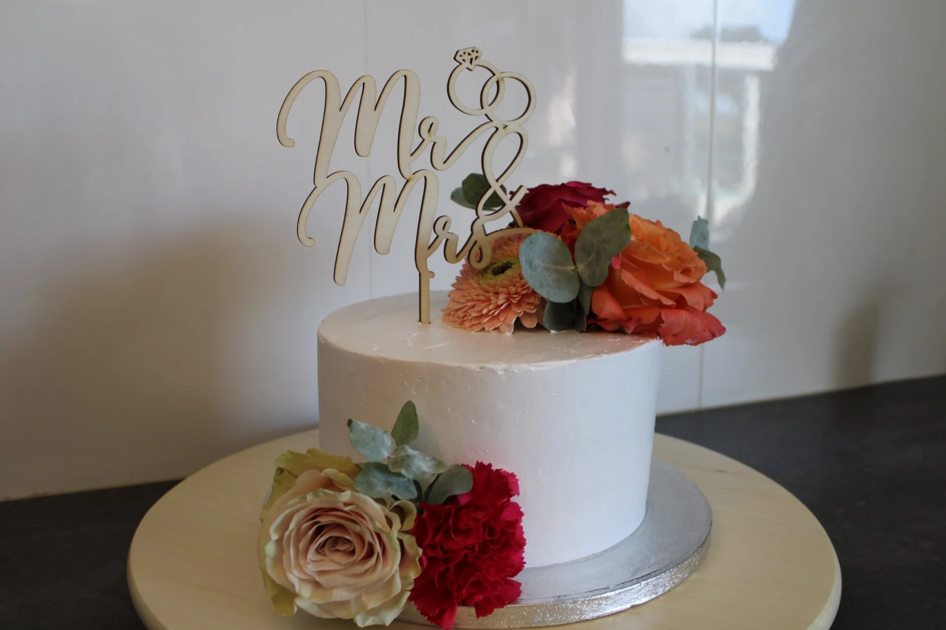 Robin en Christianne waren opzoek naar de perfecte aansnijtaart en cupcake table. Ze hadden al snel een afspraak ingepland om ideeën te bespreken en zodat ze van alles konden proeven. De aansnijtaart bestond uit 1 laag en was voor ca. 8-10 personen. Robin en Christianne hebben gekozen voor twee verschillende vullingen. Ze kozen voor aardbei creme en pure chocolade creme met verse stukjes aardbei en chocolade stukjes. De aansnijtaart is strak afgesmeerd met witte enchanted cream. Als decoratie hebben Robin en Christianne gekozen om verse bloemen te gebruiken dezelfde als in het bruidsboeket. Als topper hebben ze gekozen voor een houten taarttopper.