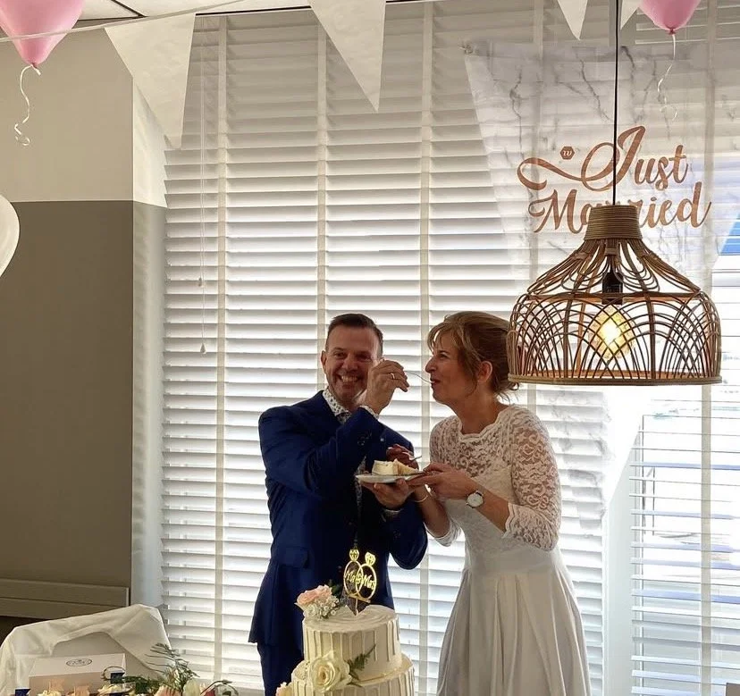 Ronny en Elza waren opzoek naar de perfecte bruidstaart. De bruidstaart bestond uit 3 lagen en was voor ca. 45 personen. Ronny en Elza hebben gekozen voor de vulling Zwitserse room in alle lagen. De bruidstaart is strak afgesmeerd met witte botercrème. Als decoratie hebben Ronny en Elza gekozen voor een witte drip en verse bloemen. De bloemen waren hetzelfde als het bruidsboeket. Verder hebben Ronny en Elza de taart afgemaakt met een gouden Mr&Mrs topper. De bruidstaart was voor mij extra bijzonder om te maken, omdat Ronny mijn schoonvader is en Elza er voor mij een extra schoonmoeder bij is geworden. Daarom heb ik de taart met veel liefde ter plekke in hun huis in Zeeland gemaakt.
