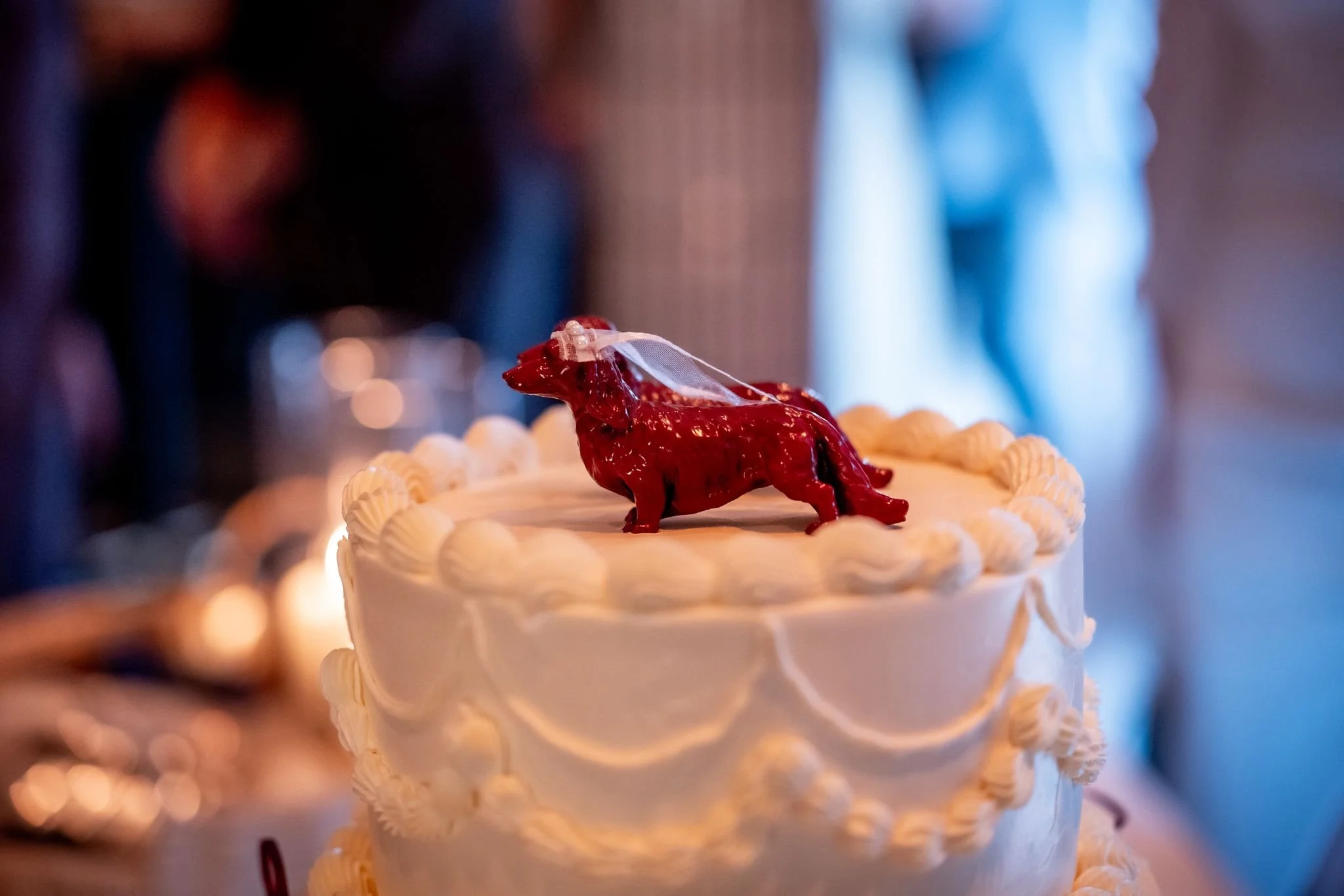 Vincent en Céline waren opzoek naar de perfecte bruidstaart. Ze hadden daarom al snel een afspraak ingepland om ideeën te bespreken en zodat ze van alles konden proeven. De bruidstaart bestond uit 3 lagen voor ca. 40 personen. Vincent en Céline hebben gekozen voor de vullingen speculoos slagroom en Zwitserse room gecombineerd in elke taart. De bruidstaart is strak afgesmeerd met witte botercrème. Als decoratie hebben Vincent en Céline gekozen om de taart op te spuiten met retro en vintage botercrème toefjes en bordeaux rode lint strikjes. Voor bovenop werd er een setje bordeaux rode teckels aangeleverd om zo speciaal voor hun de taart helemaal af te maken. De bruidstaart mocht bezorgd worden bij het Schippershuis.